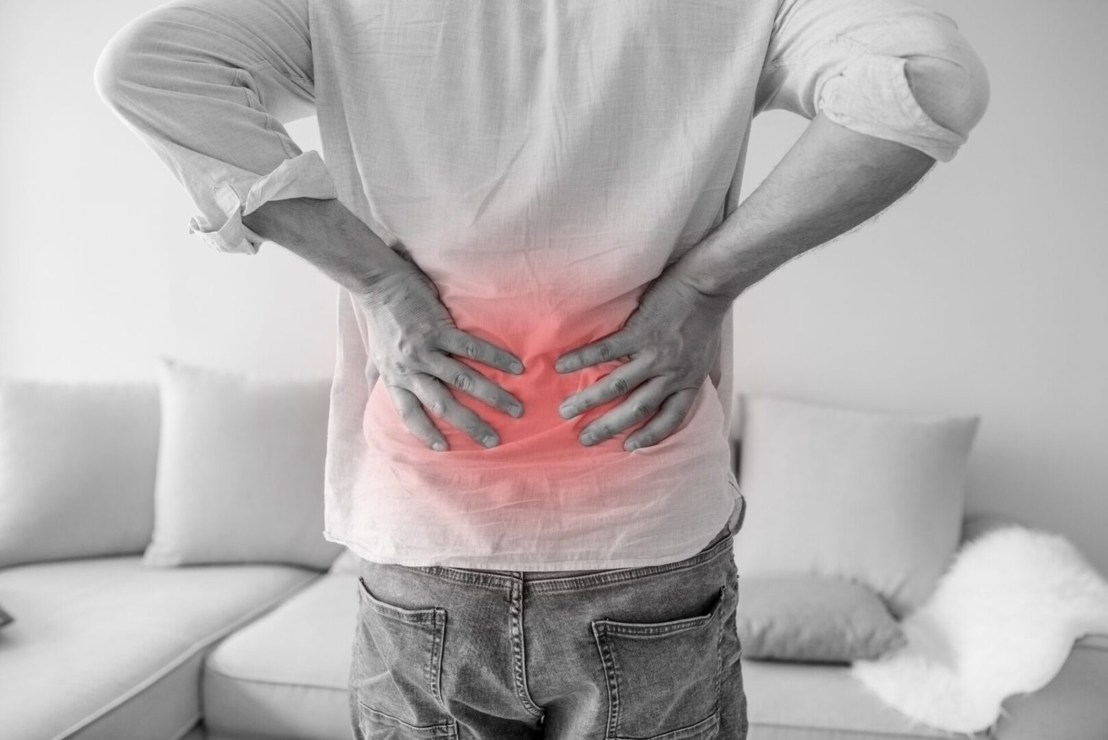 Close up of a man holding his back in pain, monochrome photo with red as a symbol for the hardening. Man suffering from back ache on gray background. Health care concept